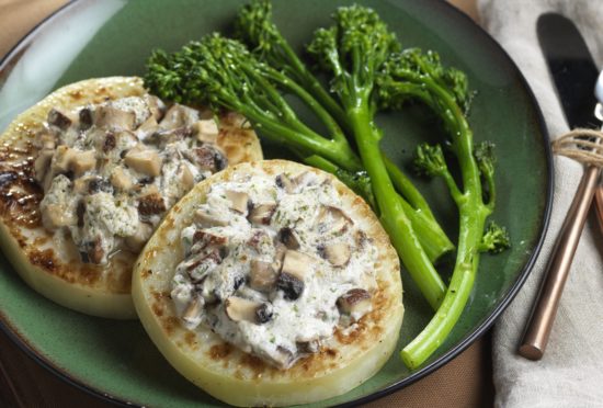 Buttered Kohlrabi Steak with Mushroom Goat Cheese Gratin and Grilled BROCCOLINI® baby broccoli
